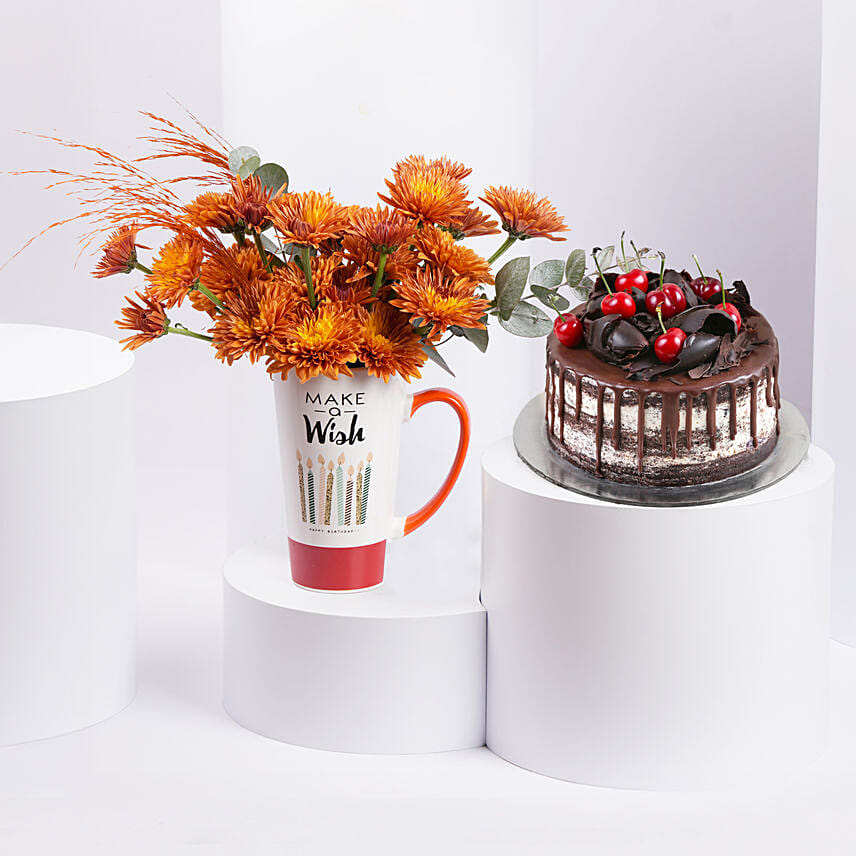 • Arranged Beautifully in Wordings Cone Shape Ceramic Mug with Black forest cake