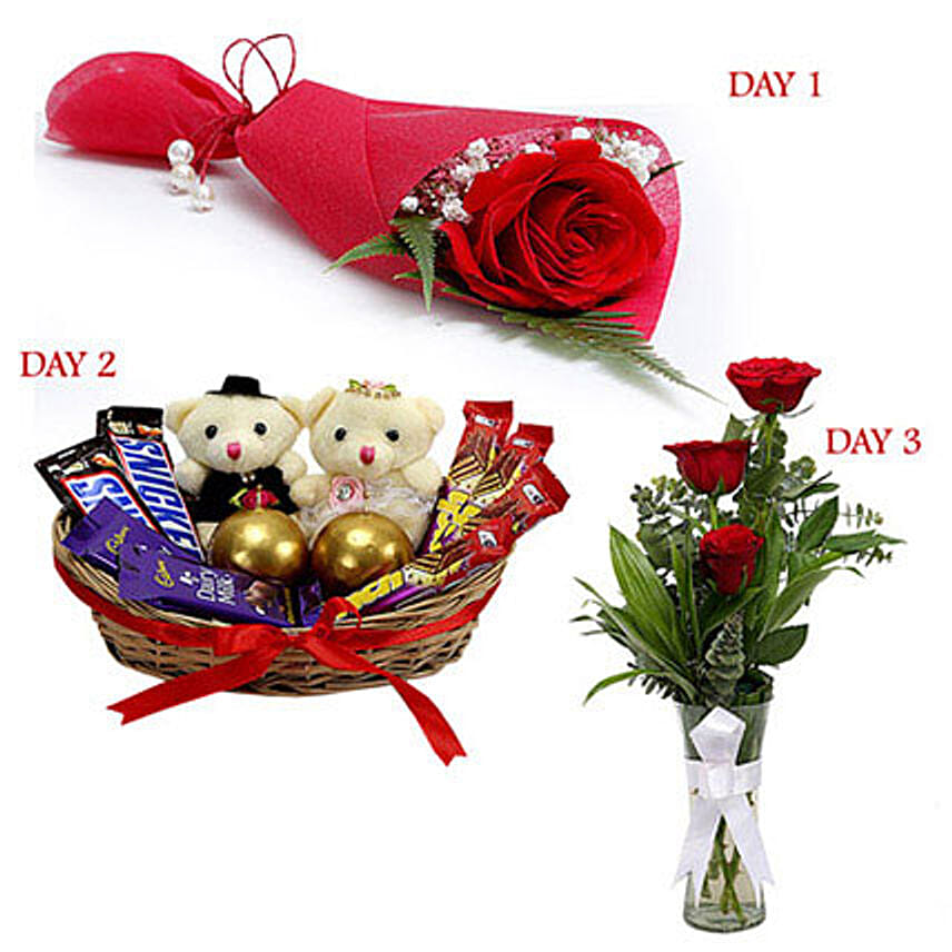 Day 1 : Single rose wrapped in a red hand woven paper tied with red thread with hanging pearl . Day 2: 54 grams each two snickers, 14 grams each of two dairy milk chocolate, 11.5 grams each of four munch, 2 inch soft toys and two golden ball candles. Day 3: 3 Red Roses in a Glass Vase.