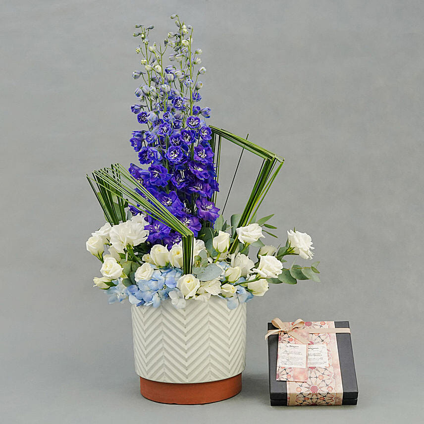 The bursting blue delphinium wears the crown of this unique arrangement of exotic flowers. With hydrangea, lisianthus, eucalyptus, and white spray roses - the bunch symbolizes tranquility, peace, and good luck. The subtle textured ceramic pot perfectly captures the essence of this delightful floral arrangement. The delectable box of mirzam chocolates elevates the joyous factor of the moment.