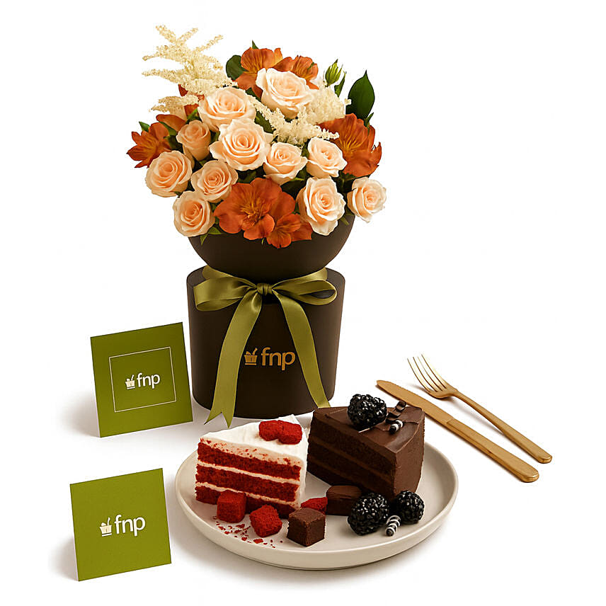 Peach Roses And Lisianthus with Red Velvet And Truffle Slice Combo