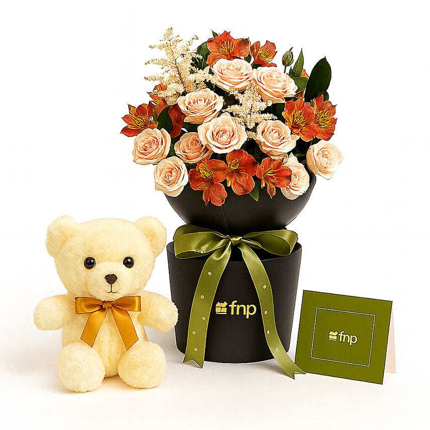 Peach Roses And Lisianthus with White Teddy Combo