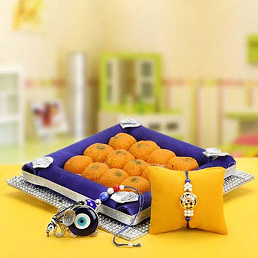 A beautiful pair of Blue Kundan Rakhi and a Lumba Rakhi set are enough to make your festival of Raksha Bandhan special in more than one way. Send this to your loving Bhaiyya Bhabhi along their favourite laddoos that are packed beautifully in a Silver tray and celebrate this occasion in ultimate style.