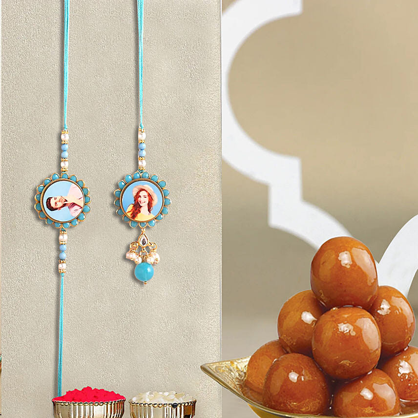 This bhaiya bhabhi rakhi set is personalised with your choice of photos for a unique look. With customization, this rakhi set will surely be admired by your brother and sister-in-law this Rakshabandhan. The beautiful flower design with added pearls enhances the visual appeal of this rakhi set.