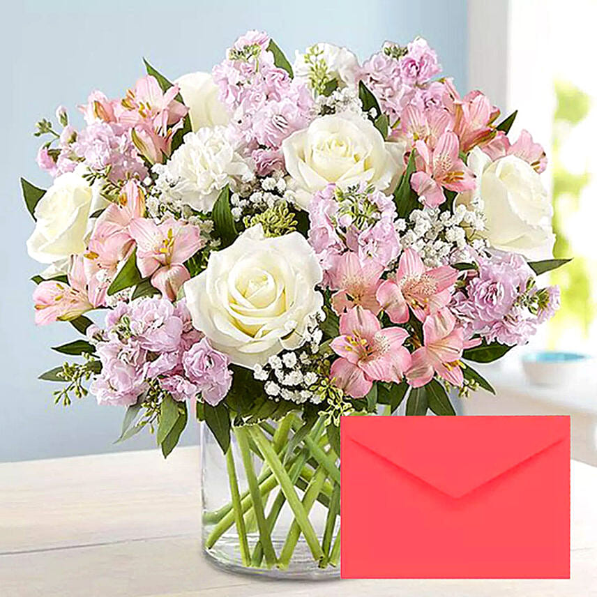 Pink and White Floral Bunch In Glass Vase With Greeting Card