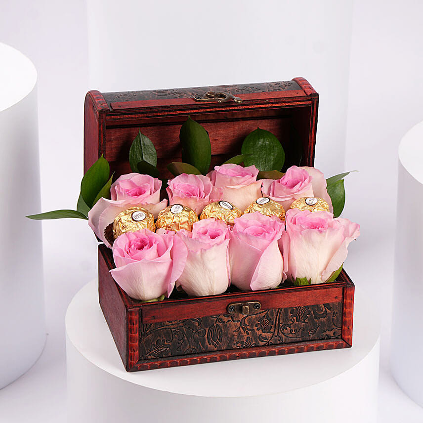 This beautiful treasure chest opens to a stunning arrangement of fresh pink roses nestled alongside indulgent chocolates, creating a perfect harmony of elegance and sweetness. Thoughtfully crafted to express love and admiration, it’s a timeless gift that turns heartfelt emotions into a memorable surprise.