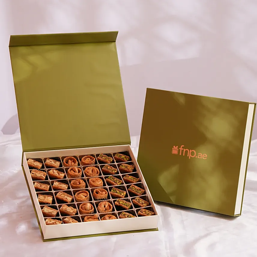 Celebrate Ramadan with indulgence and elegance through this premium assorted baklava gift box, thoughtfully curated for generous sharing and festive moments. Presented in an elegant FNP-branded large square gift box with a refined olive finish, this luxurious collection features an abundant assortment of handcrafted baklava pieces, expertly layered with crisp pastry and filled with premium nuts. Ideal for Iftar gatherings, corporate gifting, or family celebrations, this box beautifully blends tradition, richness, and sophisticated presentation.
