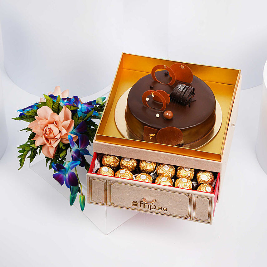 Premium Box Of Fudge Cake Flowers And Chocolates