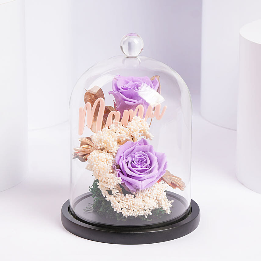 Surprise your loved one with this elegant preserved rose arrangement beautifully displayed inside a transparent glass dome. Featuring a stunning purple preserved rose accented with delicate dried florals and soft foliage, this timeless piece symbolizes everlasting love and appreciation — a perfect keepsake for Mother’s Day or any special occasion.