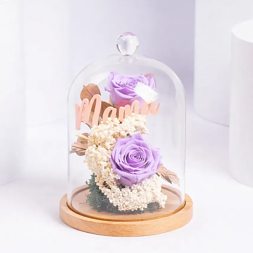 Surprise your loved one with this elegant preserved rose arrangement beautifully displayed inside a transparent glass dome. Featuring a stunning purple preserved rose accented with delicate dried florals and soft foliage, this timeless piece symbolizes everlasting love and appreciation — a perfect keepsake for Mother’s Day or any special occasion.