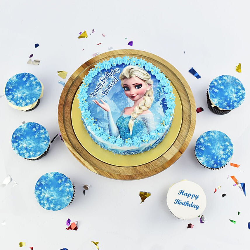 A Yummy Princess Elsa photo cake along with cupcakes to make their birthday special!