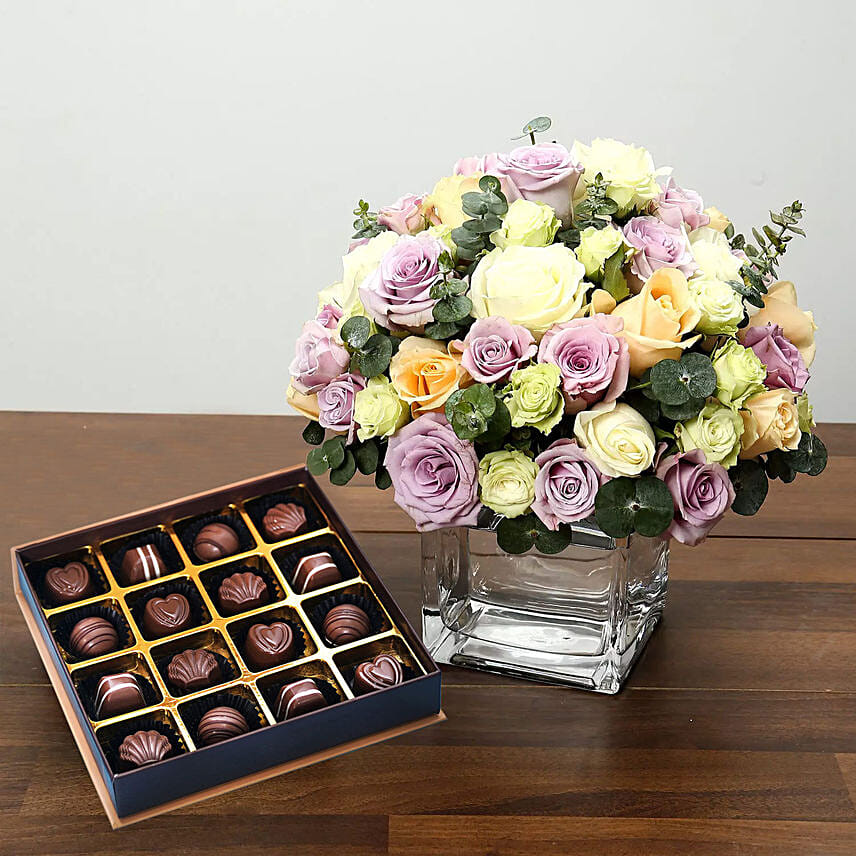 Purple and White Roses Array With Belgian Chocolates