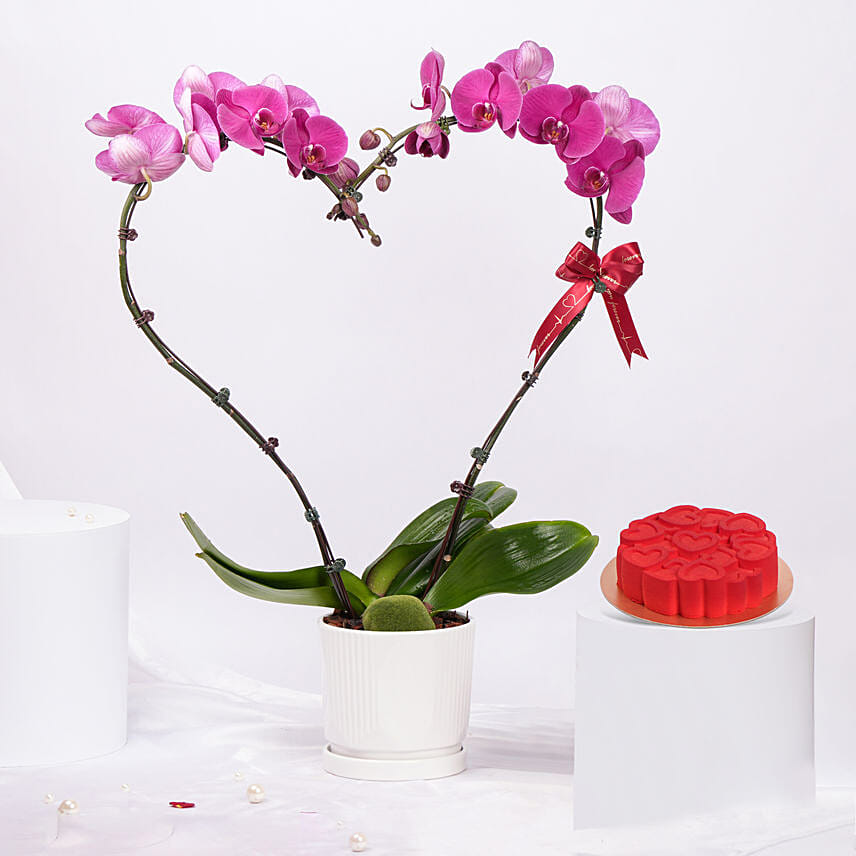 Symbolizing beauty, grace, and enduring affection, the vibrant pink orchid blooms form a perfect heart, making it a stunning centerpiece for any romantic occasion. Each petal is a testament to the care and devotion shared between two hearts, while the deep green foliage and carefully arranged stems reflect balance and harmony in love. The finishing touch of a red ribbon bow adds a hint of festive charm, making it an unforgettable gift for Valentine's Day or an anniversary.