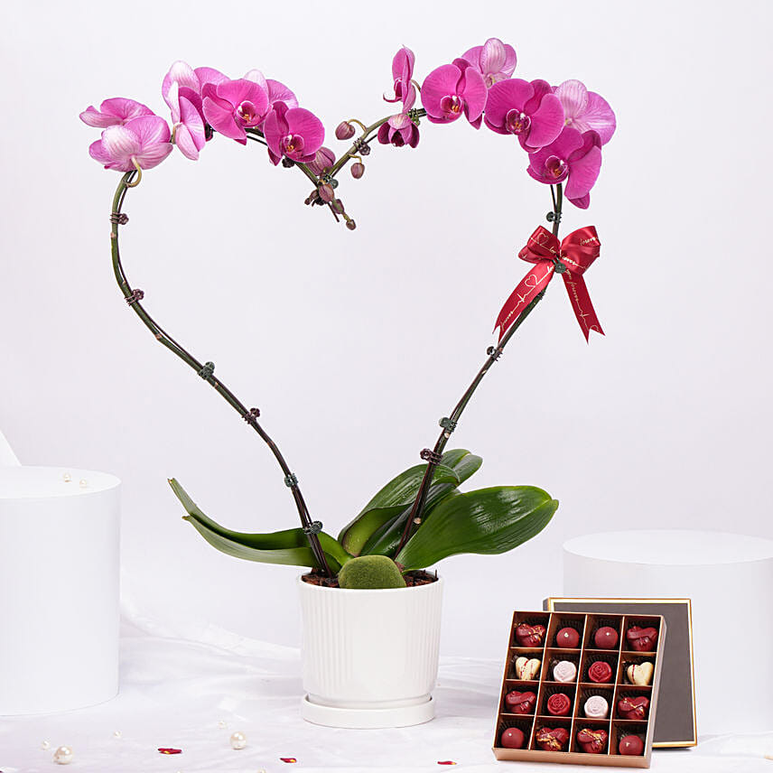 Symbolizing beauty, grace, and enduring affection, the vibrant pink orchid blooms form a perfect heart, making it a stunning centerpiece for any romantic occasion. Each petal is a testament to the care and devotion shared between two hearts, while the deep green foliage and carefully arranged stems reflect balance and harmony in love. The finishing touch of a red ribbon bow adds a hint of festive charm, making it an unforgettable gift for Valentine's Day or an anniversary.