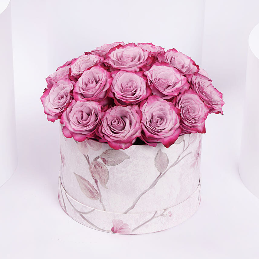 In a world where elegance meets artistry, this exquisite purple rose arrangement stands as a testament to grace, admiration, and timeless love. Each rose, with its soft lilac petals deepening into a rich purple hue at the edges, tells a story of mystery, enchantment, and deep emotions. Housed in a vintage-inspired floral hatbox, the arrangement embodies both classic charm and modern luxury. The muted floral print on the box harmonizes perfectly with the bold beauty of the roses, making it a masterpiece of refined aesthetics. More than just a bouquet, this creation is a symbol of admiration, appreciation, and heartfelt connection a perfect gift for someone who deserves nothing but the best. Whether given as a romantic gesture, a token of gratitude, or a sophisticated centerpiece, it speaks the language of enduring elegance and deep emotions.