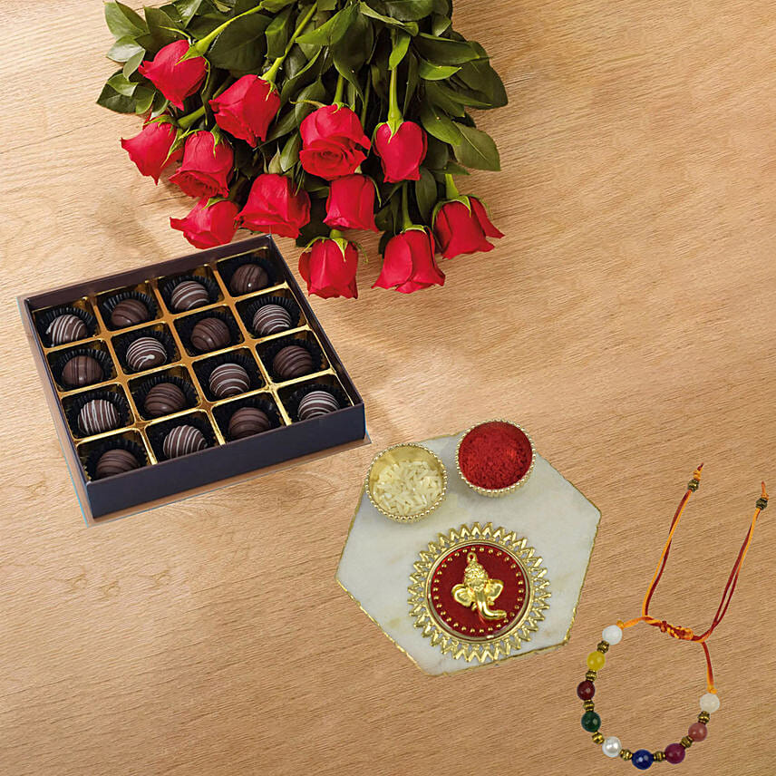 Colourful beads are combined to create this unique style of rakhi which is a modern take on the traditional rakhis. The brass element in between gives the rakhi a crisp look and it has a readymade easy knot that needs just adjustment for tying. The beautiful flower arrangement and premium chocolates accompanying the rakhi will add extra happiness to the joyful festival.