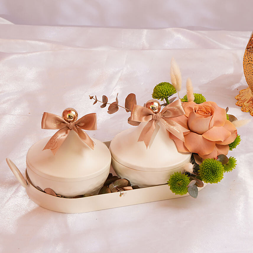 Celebrate the elegance and generosity of the holy month with this beautifully curated Ramadan dry fruits and dates arrangement, thoughtfully designed to blend tradition with refined aesthetics. Presented on a premium off-white metal platter featuring two matching bowls with decorative lids, this graceful set includes an assortment of premium dates and cashews, carefully selected for Iftar sharing. Accented with a stunning cappuccino rose, natural dried florals, and soft greenery, this arrangement makes a sophisticated Ramadan gifting choice or a charming addition to festive table décor.