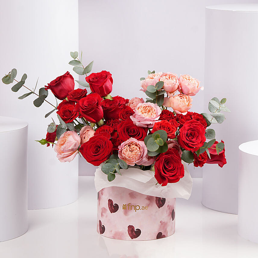 Red And Peach Roses In Heart Hat Box
