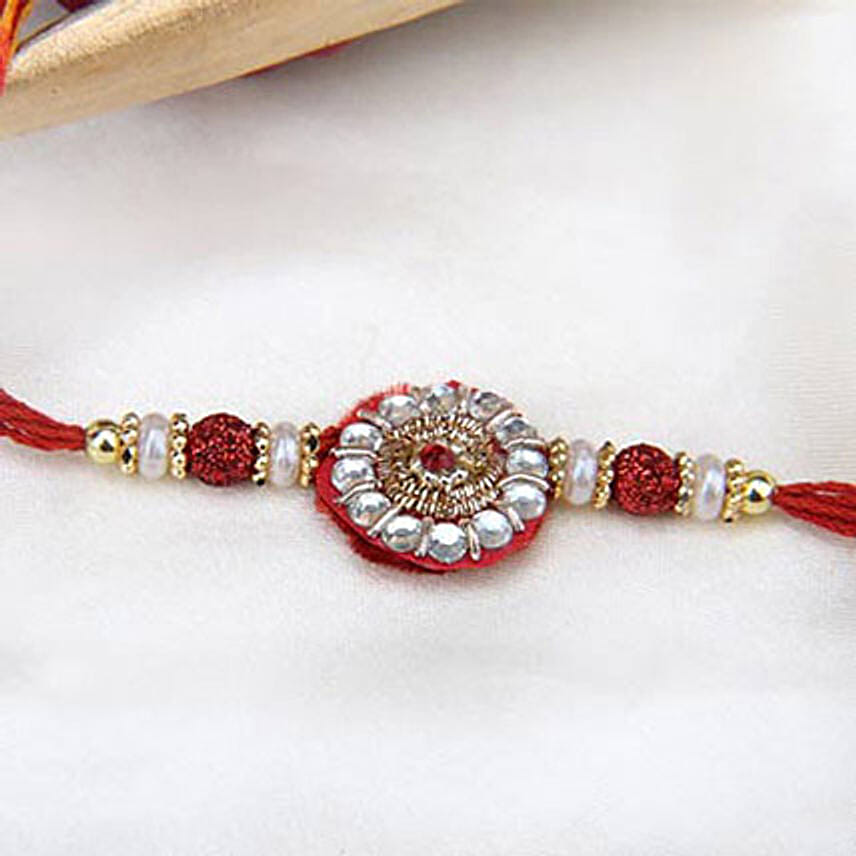 • Red and Silver Embellished Pearl Rakhi with complimentary Roli Chawal