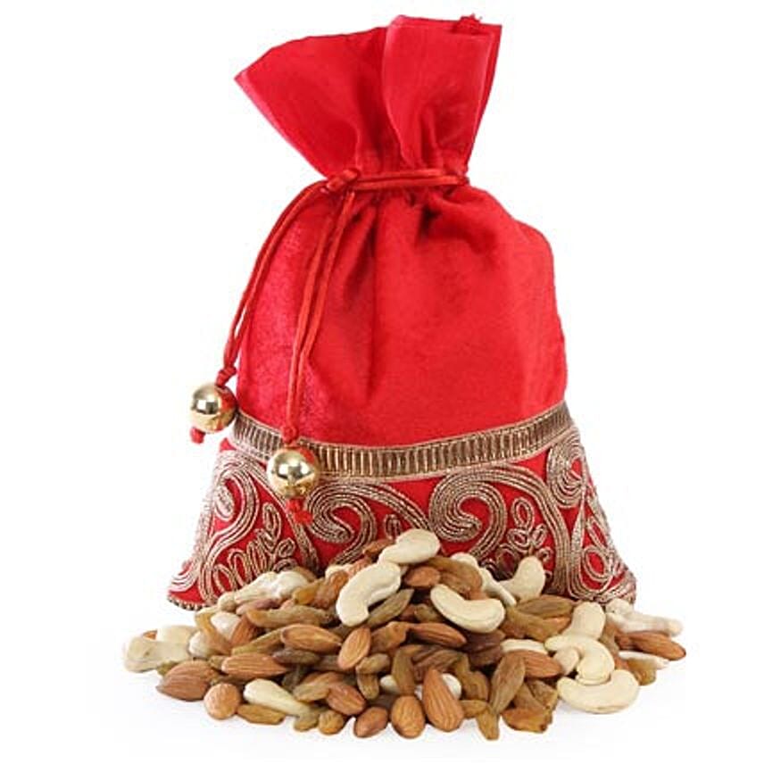Highly embellished red coloured designer potli bag here is filled with a generous amount of cashews, almonds, and raisins which surely is a perfect gift for mesmerizing your loved ones. Especially on occasions like Eid this would be highly recommended because people fast for long hours at this time and these dry fruits would take good care of mind and body.