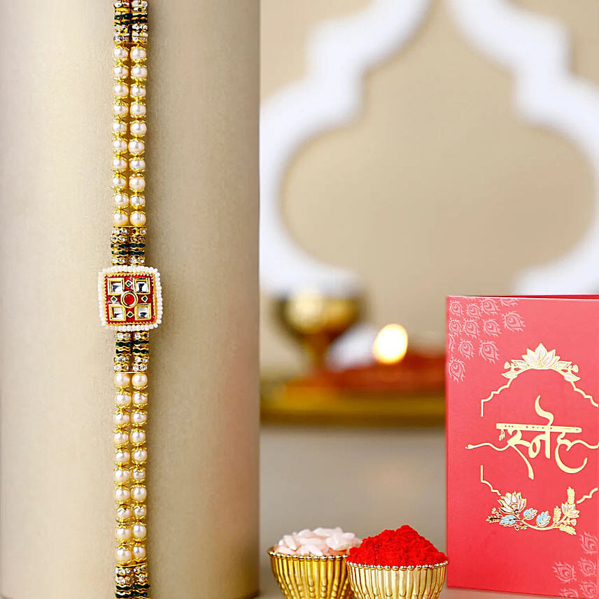 Celebrate Raksha Bandhan with our stunning Regal Ethnic Rakhi, shining in beautiful gold tones and gemstones showcasing elegance and luxury. Adorned with intricate designs, it exudes a timeless charm and sophistication. This Rakhi is carefully crafted with attention to detail, reflecting tradition with a touch of glamour. Its shimmering gold colours make it feel royal and special, perfect for honouring the bond between siblings. Great for brothers who honour tradition with a touch of elegance.