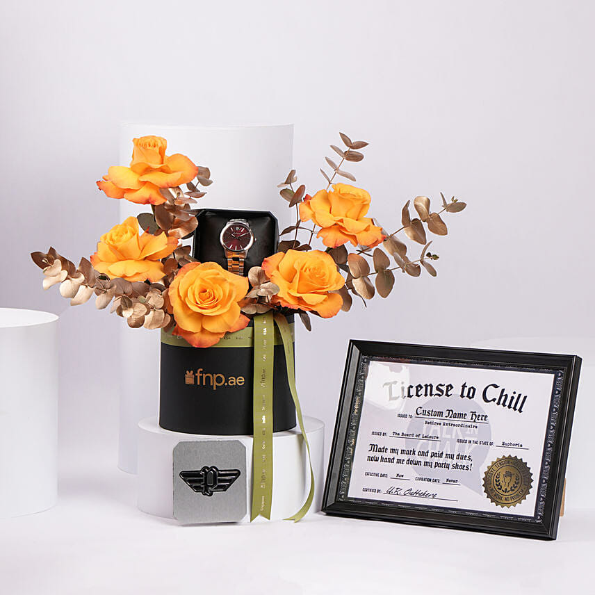 A present of orange roses with watch bursts with energy and passion, symbolizing the excitement of new beginnings. Given as a gift, these vibrant blooms convey heartfelt enthusiasm and a promise of adventures yet to come.