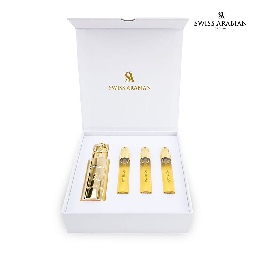 Rose 01 Is A Floral Fantasy That Transports You To A Mythical Garden Fit For A Goddess. Invigorating Bergamot And Sweet Pink Pepper Berries Tempt You Closer To Mouth-Watering Lychee. Majestic Roses Mingle With Pink Peonies To Form A Crown Of Romantic Flowers That Dazzle The Senses. An Embrace Of Golden Vanilla And Sensual Musk Brings A Velvet Cloak Of Cashmere Woods To Elegant Shoulders. Rose 01 From The House Of Swiss Arabian Wants You To Have A Pleasing Journey Through Our Experience Sets Which Has 3 Refills Of 10ML Each Along With A Zamac Metal Case Which Is Designed In A Way To Be Used On The Go And Can Fit In Your Hand, Pocket, Jacket Or While Travelling. The Metal Case Spray Holds 10ML Refills. The Rose 01 Experience Set Is A Wonderful Gifting Item & A Way To Experience Its Beautiful Fragrance Journey.