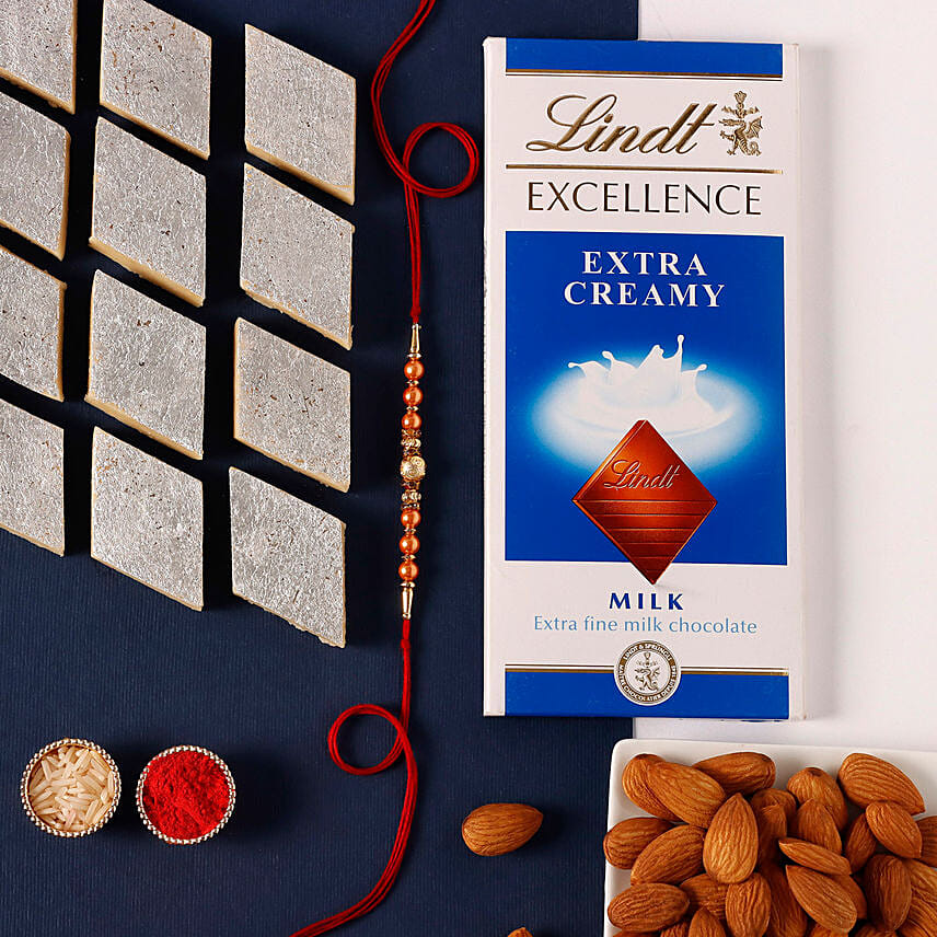 Rose Gold Pearl And Beads Rakhi with Lindt Bar and Kaju Katli