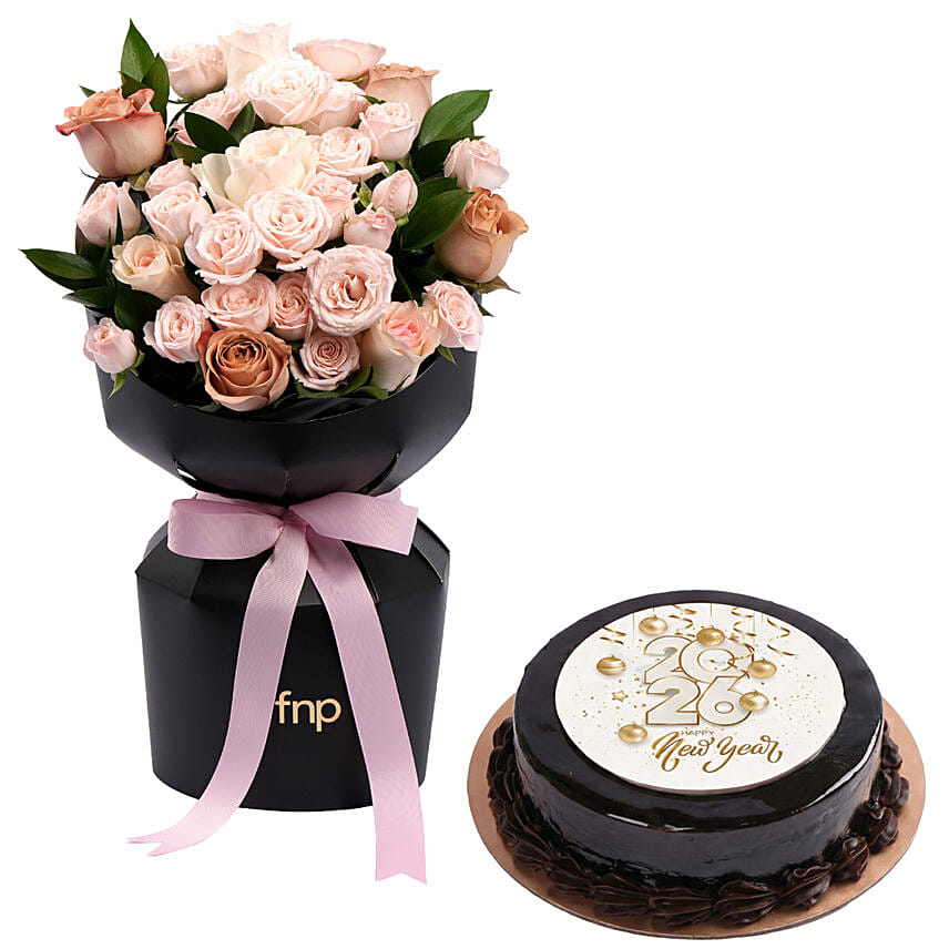 Roses Beauty Bouquet with Royal Ganache New Year Cake