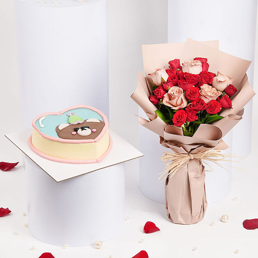 Roses Bouquet with Teddy Celebration Cake