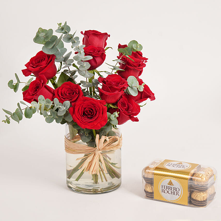 Roses in Vase with 16 Pcs Ferrero Rocher Chocolate