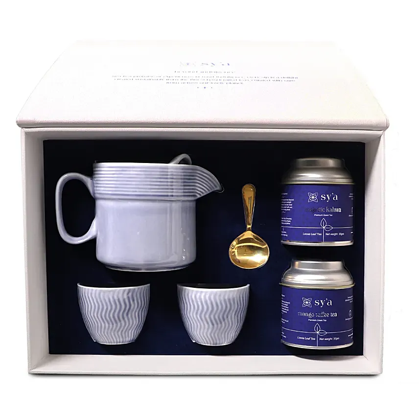 our most indulgent tea set - a regal gift for a regal couple. this is a gift that speaks royalty, without saying it out loud. combines the most elegant tea set and the finest tea, for only the most distinguished of patrons. the set contains two kahwah cups, a tea kettle, an infuser measuring spoon and a tin of any of our finest white teas or oolong tea.mango toffee tea - treat yourself to the regal taste of avant-garde mangoes with the decadence of caramel. a tropical dream with a hint of cream, this is tender loving care for the child inside you. lychee blush tea - experience what the sweet smell of roses wafting across lychee farms is like, from the comfort of your home. a story set in sweet heaven, tempered with a kiss of earthy fennel