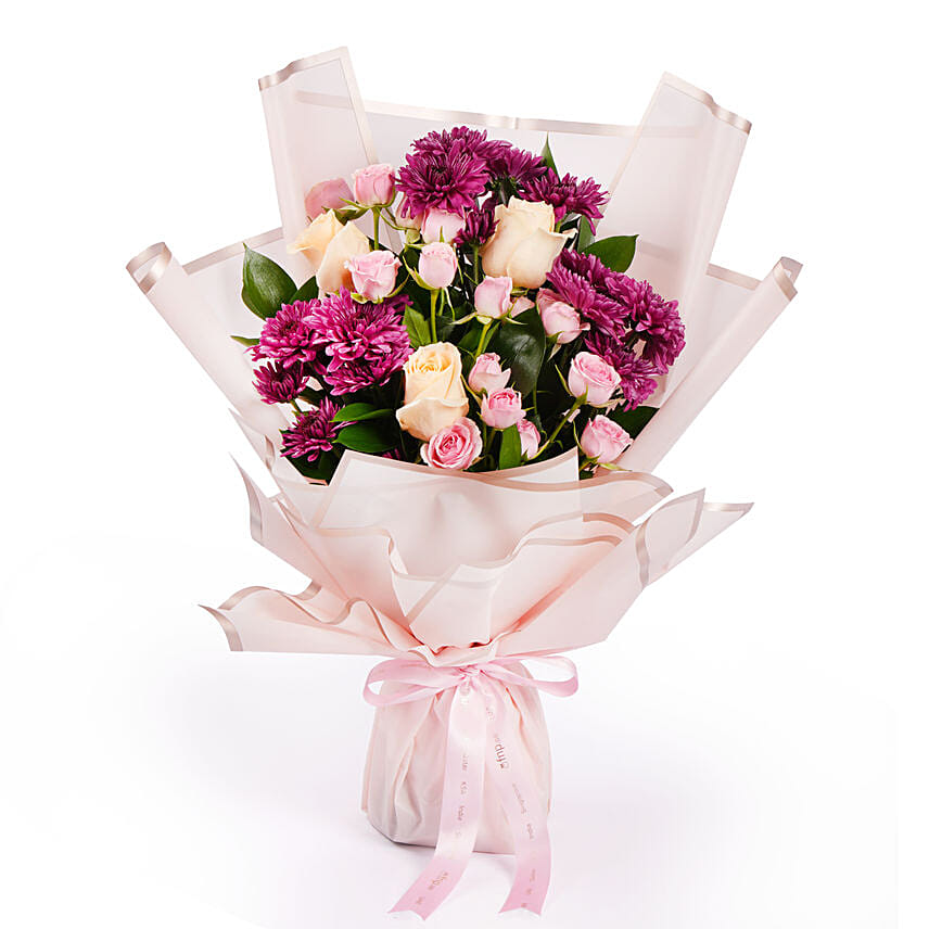 • A charming mix of purple chrysanthemums, peach and spray roses