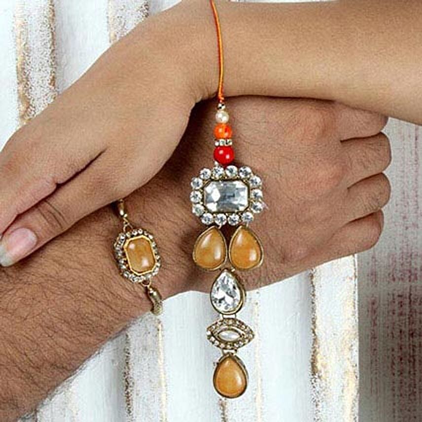 • White Kundan and Brown Stones Bhaiya Bhabhi Rakhi with complimentary Roli Chawal