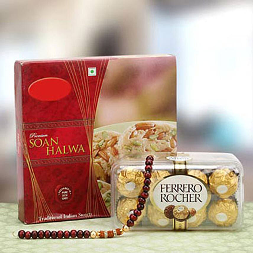 All our lavish festivals demand something sweet and gorgeous – right? So, here comes a premium pack of Soan Halwa with loads of dry fruits, Ferrero Rocher chocolates, and a rudraksha with beads rakhi. Wish your brother on this happy occasion of Raksha Bandhan with these mesmerizing gift hamper.