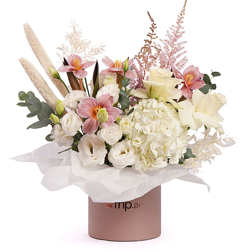 A graceful mix of white hydrangea and roses, soft pink astilbe, brown painted tulips, and delicate fillers including lisianthus, eucalyptus, lagurus, and babla for a timeless, sophisticated arrangement.