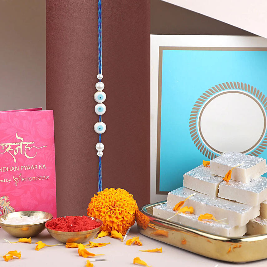 Simplistic Blue Evil Eye Rakhi N Kaju Katli