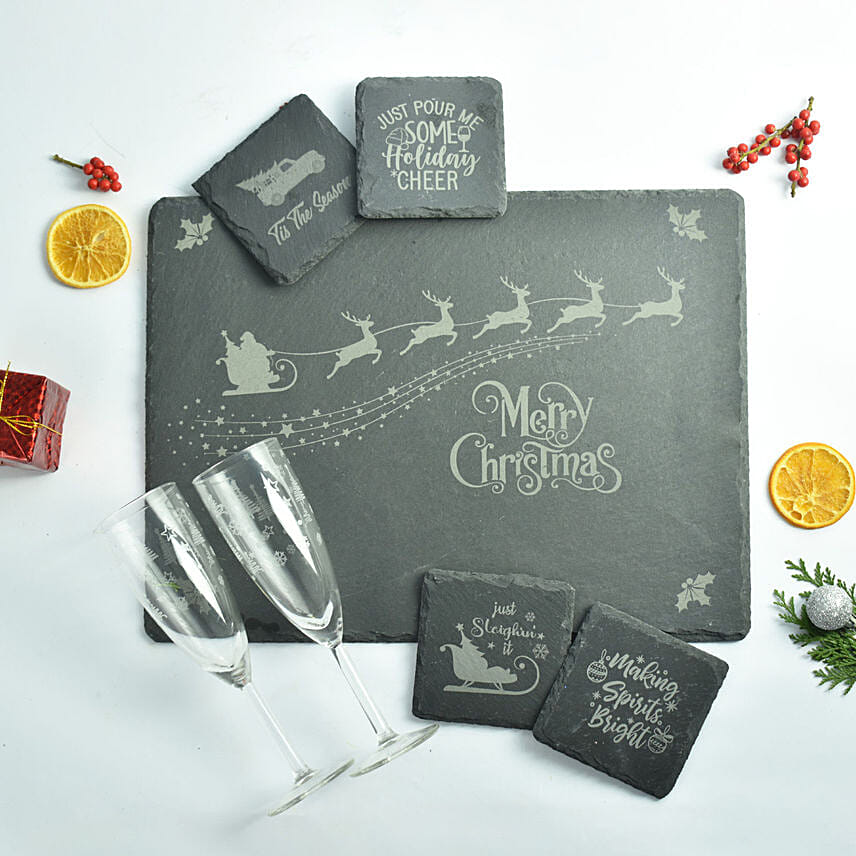 A thoughtful gift for your friends and family!! A Christmas theme slate board set with glasses to enjoy the holiday season. This is an amazing gift idea to send celebratory vibes during Xmas time.