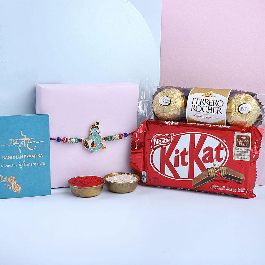 This delightful rakhi is designed with the utmost care, featuring a charming image of Bal Krishna, radiating warmth and innocence. Let this rakhi adorn your little brother's wrist and fill his day with joy and happiness. Along with the rakhi, this special package includes a delicious kitkat chocolate bar and delectable ferrero rochers to sweeten the celebration. With complimentary roli and chawal, this gift embodies the bond between siblings, symbolising the eternal love and protection that brothers provide.