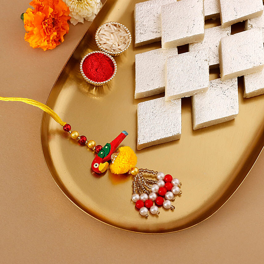 • Decorated with a beautiful parrot, this bright Lumba rakhi will fill the heart with joy. Enhance the festive mood with the hanging tassel of colourful beads on the lumba. The added delicious kaju katli will sweeten-up the auspicious occasion.