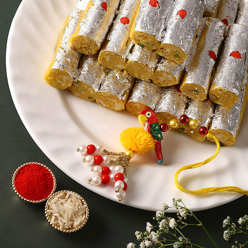 • Decorated with a beautiful parrot, this bright Lumba rakhi will fill the heart with joy. Enhance the festive mood with the hanging tassel of colourful beads on the lumba. The sumptuous taste of kaju rolls made with pure ingredients will turn the festival flavourful.