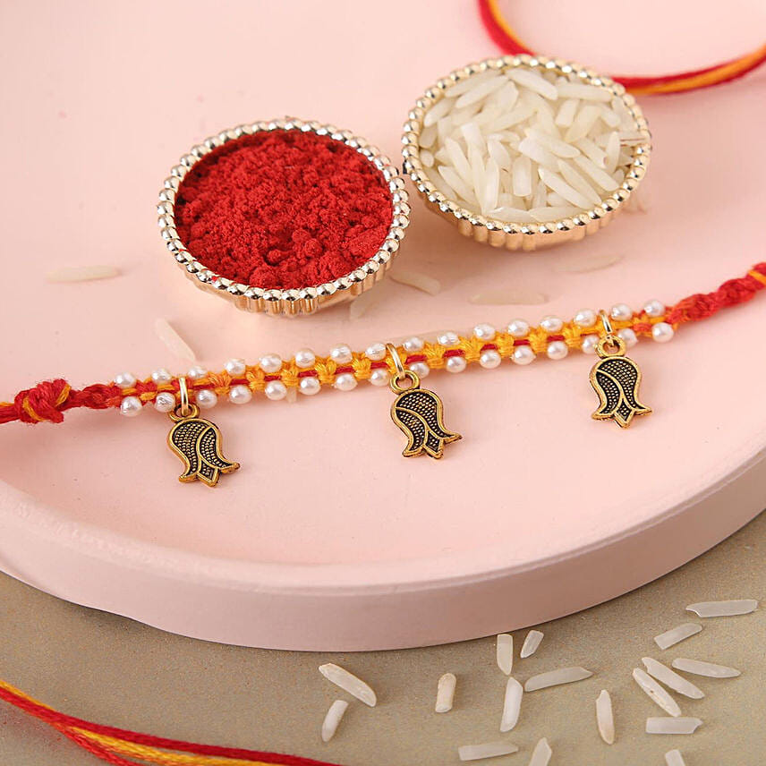 A unique and auspicious rakhi adorned with feng shui beads, symbolising good luck and positive energy. This rakhi serves as a beautiful and meaningful token of love and protection between siblings. It comes with complimentary roli and chawal to perform the traditional tilak ceremony with ease. Celebrate the special bond of siblinghood with this stunning rakhi that not only exudes style but also carries the blessings of positive energy and prosperity.