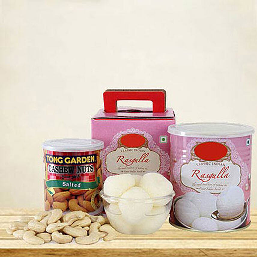Feel no less than a prince/princess. Gorge this scrumptious piece of rasgullas while munching those irresistible cashews. This hamper can be the perfect gift for occasions like Diwali, Rakhi, Bhaiya dooj and many more to list down. This gift combo includes - one rasgulla pack of one kg and one tin pack of tong garden salted cashew nuts of 140 grams.