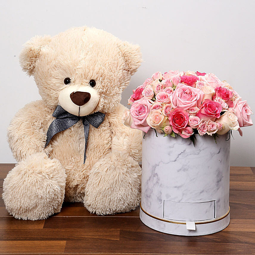 Stylish Box Of Pink Roses With Chocolates and Teddy