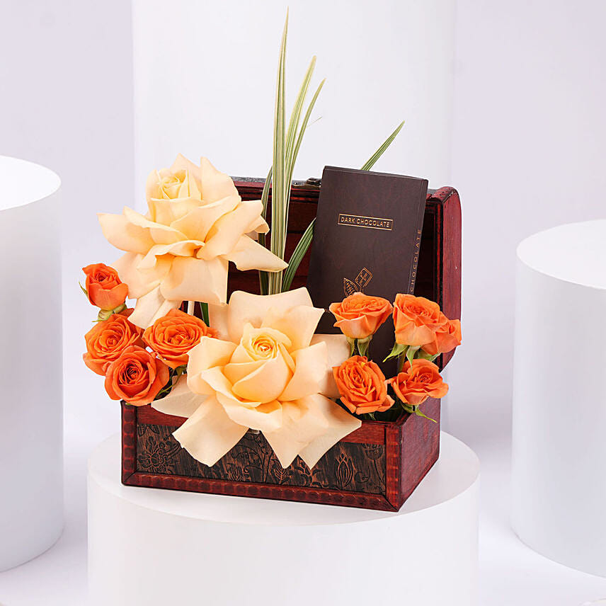 This exquisite treasure chest blooms with elegant peach and orange roses, thoughtfully paired with a touch of chocolate indulgence for a truly refined gift. Designed to impress and delight, it beautifully captures warmth, admiration, and heartfelt emotions, making every celebration feel extra special.