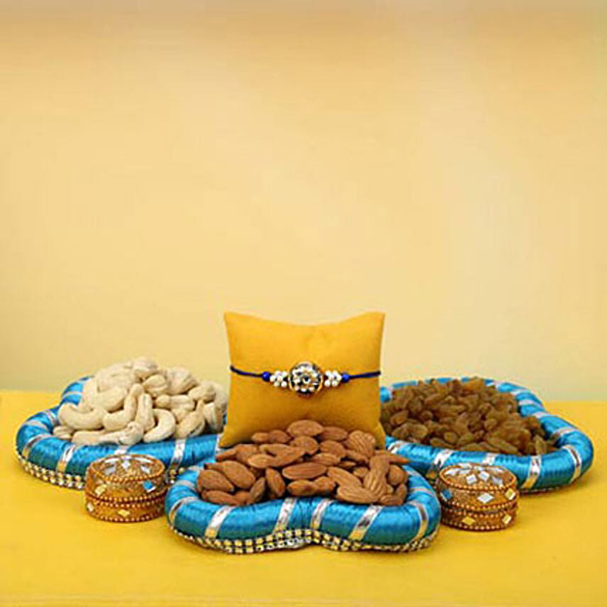 The rich dry fruits and bright Blue Rakhi makes up for an ultimate Rakhi Gift for your brother on the special day of Rakhi. The beautiful Kundan work adds a lot of charm to your sibling bond and can take your sibling relationship to an entirely new level.