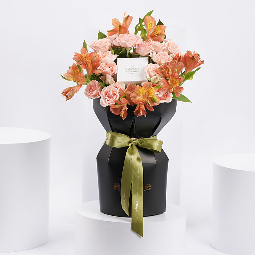 Caroline Svedbom Vintage Rose Stud Earrings - A Timeless Gift of Elegance Elevate her style with the Caroline Svedbom Classic Stud Earrings in a stunning Vintage Rose color, a beautiful blend of sophistication and charm. Exclusively handmade in Greece, these earrings are adorned with sparkling Swarovski crystals that capture the light in the most enchanting way. The earrings are crafted from high-quality brass and plated with 18k gold, ensuring a radiant finish that is both durable and elegant. Designed to be nickel and cadmium-free, these earrings are as comfortable as they are beautiful. This exquisite gift is presented alongside a vibrant, multicolor bouquet of fresh flowers, creating a stunning display of natural beauty and timeless elegance. Perfect for any occasion, the Caroline Svedbom Vintage Rose Stud Earrings, paired with the lovely floral arrangement, make a heartfelt gift that she will treasure forever.