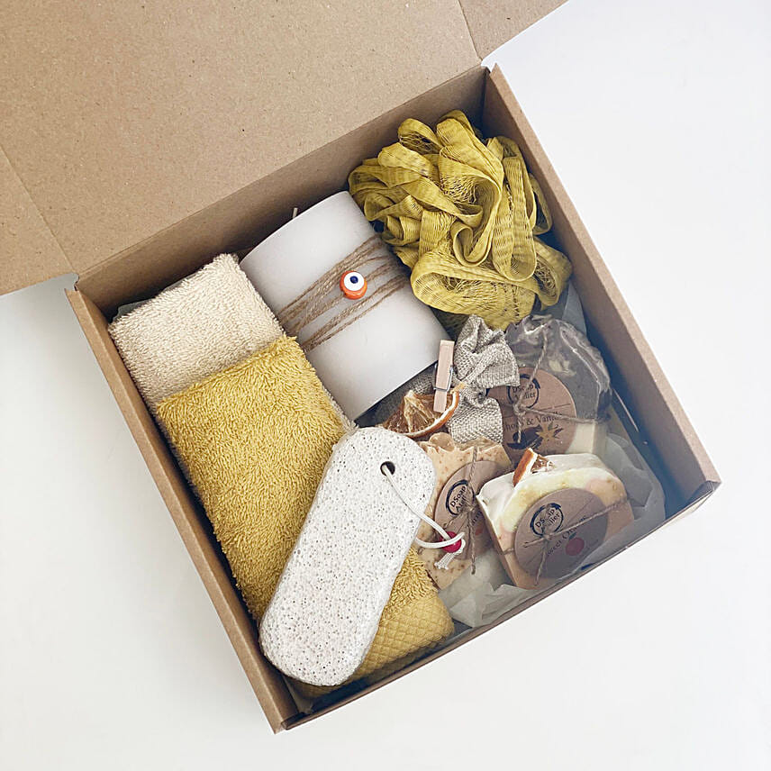 • Some like it bright as a sunshine! A box including large hammam towel, scented candle, 3 handmade soaps, an exfoliater, drawer bag and a loofa!
