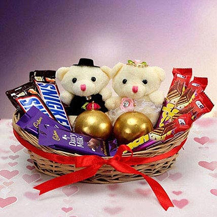 If you are stuck for ideas of that perfect gift for that special someone, look no further. This gorgeous basket has been lovingly put together to include 54 grams each two snickers, 14 grams each of two dairy milk chocolate, 11.5 grams each of four munch. But the best bit is the gorgeous little 2 inch soft toys and two beautiful candles.