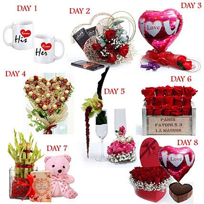 • and Gypsophilia. Day 3: 2 Pearl Studded Red Roses with Chocolates & I Love You Balloon. Day 4: Heartshape Arrangement of Ferrero Rocher 16 Pcs. Day 5: 2 Champagne Glasses
