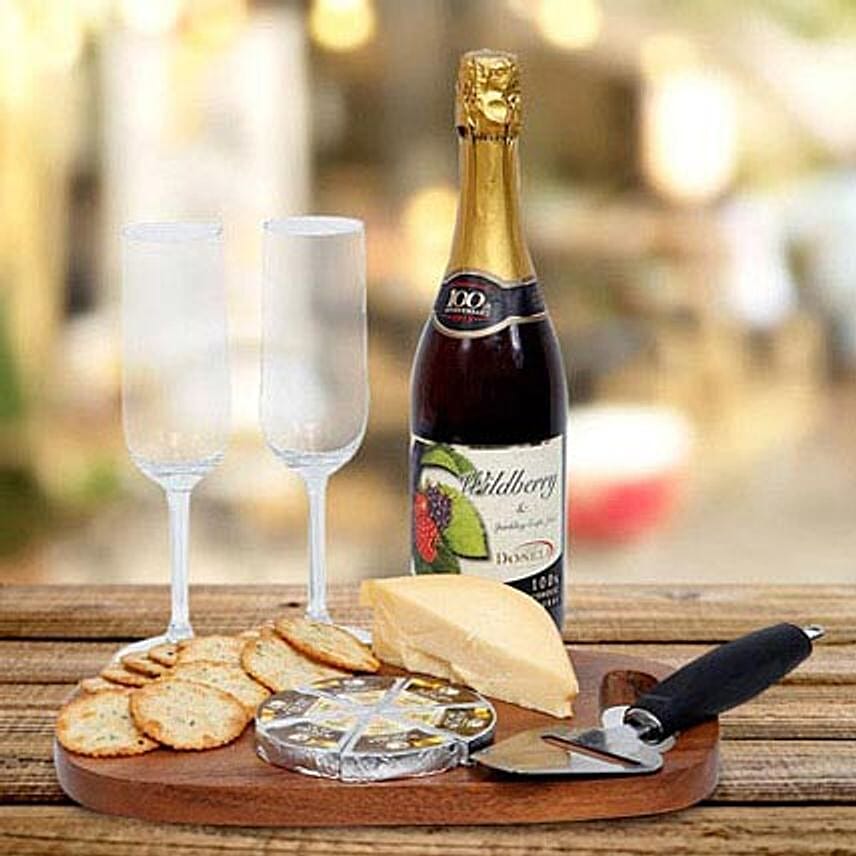 Enjoy the tempting pleasure of Cheese in this exclusive gift hamper that includes wooden Cheese board with Gouda Cheese, President Cheese cubes, Table water crackers, stainless steel Cheese cutter with Donelli wildberry Grape juice along with the champagne glasses. This is a wonderful gift hamper to spend a beautiful evening with your loved ones and can make the celebrations really memorable. Offer this tempting introduction to your cheese lovers along with this exotic bouquet.